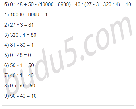 | б) 0 : 48 + 50 • (10000 - 9999) - 40 : (27 • 3 - 320 : 4) |
